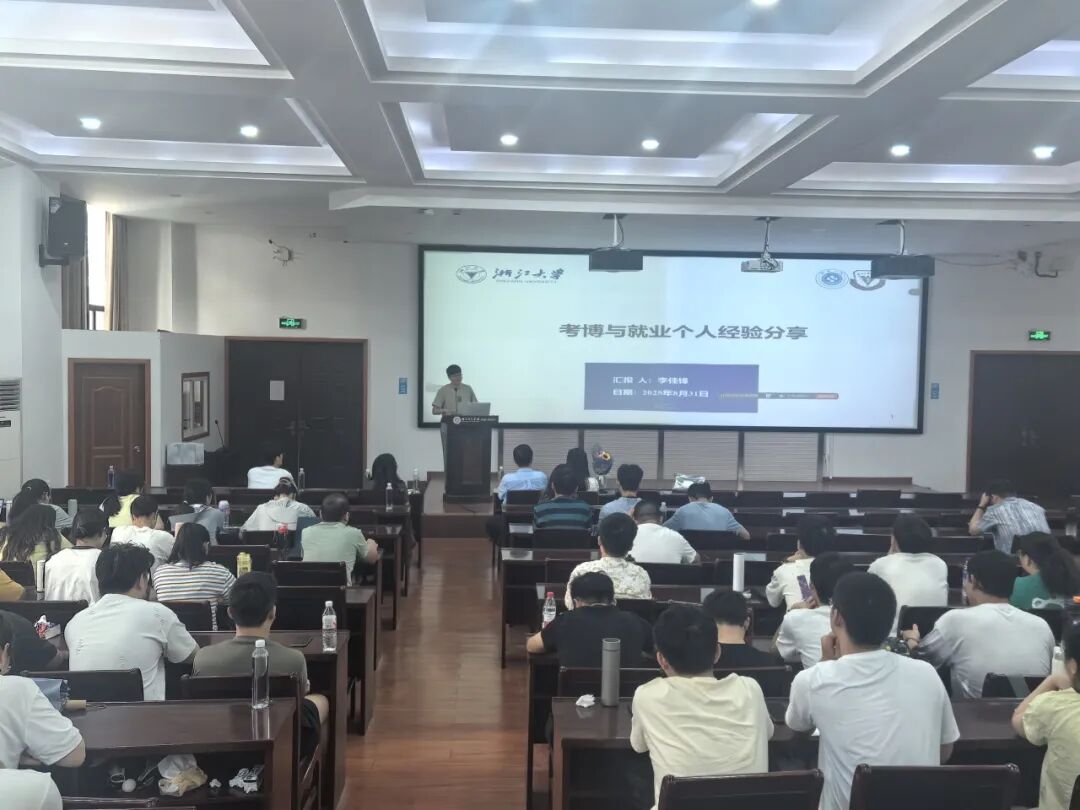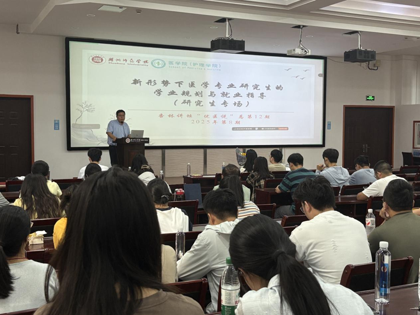 为进一步提升医学院(护理学院)硕士研究生培养质量,扎实做好2025级研究生新生始业教育,以及2026届毕业生的考博动员与就业指导工作,帮助学生科学规划学业与职业发展路径。8月31日,医学院(护理学院)成功举办“优医说”第12期专题活动 ——“新形势下医学专业研究生的学业规划与就业指导”主题报告。活动邀请我校2018届优秀校友、浙江大学医学院求是副研究员、浙江大学医学院附属第一医院主治医师、浙江大学临床医学博士李佳锋,我校2016届优秀校友、浙江中医药大学护理学院教师、浙江大学护理学博士蔡倩担任主讲嘉宾。本次活动采用线上线下相结合的形式举办,医学院(护理学院)相关领导、辅导员和300多名硕士研究生共同参与,活动由学院党委副书记董建新主持。