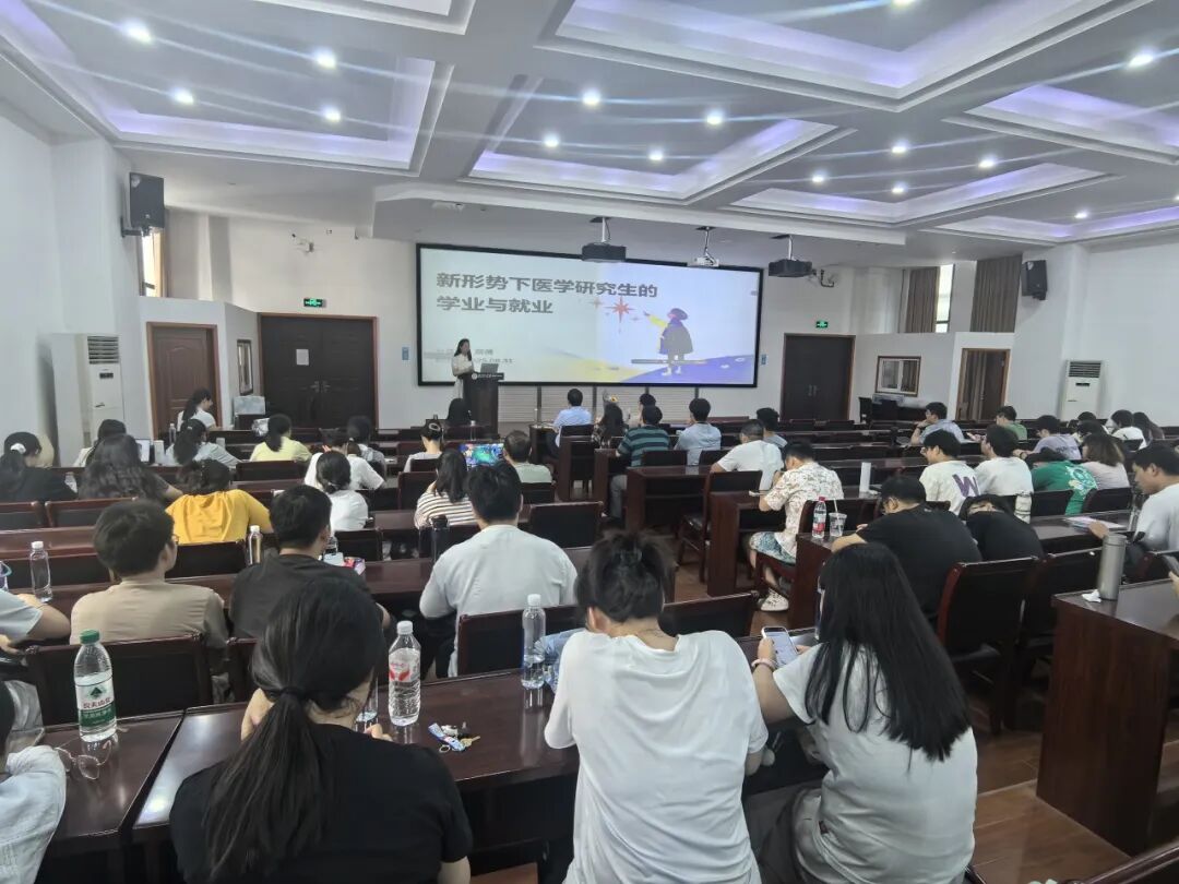 董建新紧扣当前医疗卫生领域政策调整方向与就业市场动态变化,深入剖析了新形势下医学专业研究生的发展机遇与现实挑战。他强调,医学研究生要尽早树立清晰的学业规划,并建立合理的就业预期,主动将模糊的长期发展规划,拆解为可落地的阶段性行动方案,切实避免在学业成长中陷入“方向迷茫、行动空转”的被动困境。针对同学们普遍关注的成长困惑,他进一步寄语全体同学:“以深度思考锚定发展方向,以务实行动对抗成长焦虑”。面对医疗行业变革带来的不确定性,大家不仅要沉下心来、脚踏实地,在实验中锤炼科研思维,在文献深耕中积累学术视野,以此打磨科研硬实力;更要在专业知识学习中筑牢理论根基,在科室轮转中提升临床能力,以此夯实专业基本功。与此同时,还要主动打破认知壁垒、拓宽职业视野,不局限于单一发展路径,精准捕捉“健康中国”战略下医疗卫生领域的人才需求机遇。