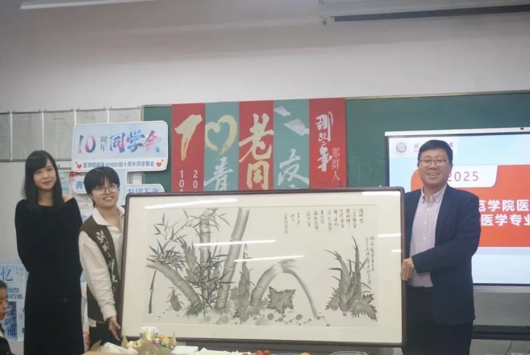 活动上,董书记向 20101025 班校友们的到来致以最热烈的欢迎,并代表学院向到场的校友们颁发校友纪念品,感谢大家持续关心支持学校学院的发展,希望大家继续积极支持校友工作,共同为母校母院的发展凝聚力量;随后班主任顾老师与张老师依次上台,介绍近十年来母校母院的发展变化,并祝愿大家学有所获、事业有成、家庭美满。最后,在热烈的掌声中,校友代表将一幅精心创作的竹画赠予母院。画中的墨竹挺拔坚韧、清风傲骨,不仅象征着校友们对母校母院深深的眷恋之情,更寄托了对母校母院“节节高升、人才辈出” 的美好祝愿。这份礼物,将成为连接校友与母院深厚情谊的重要纽带。